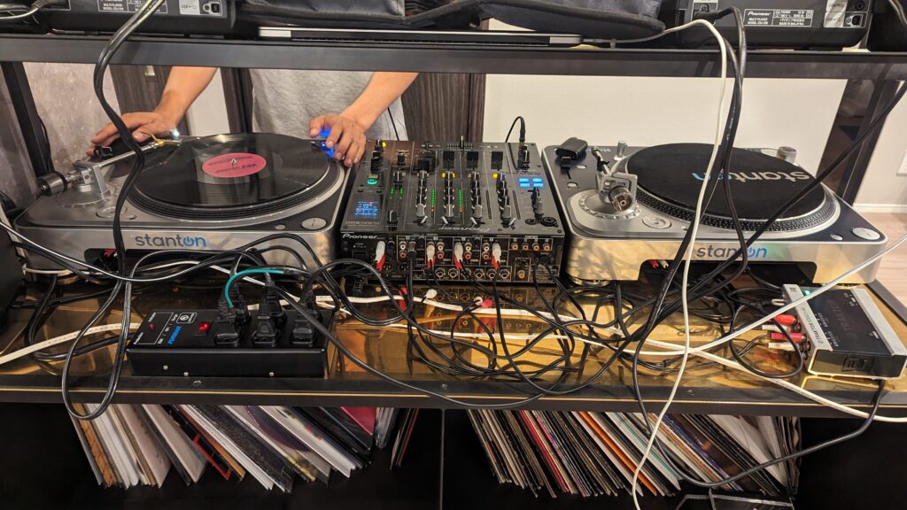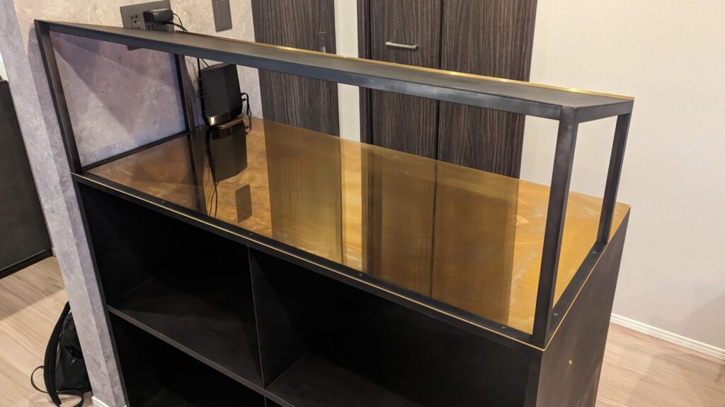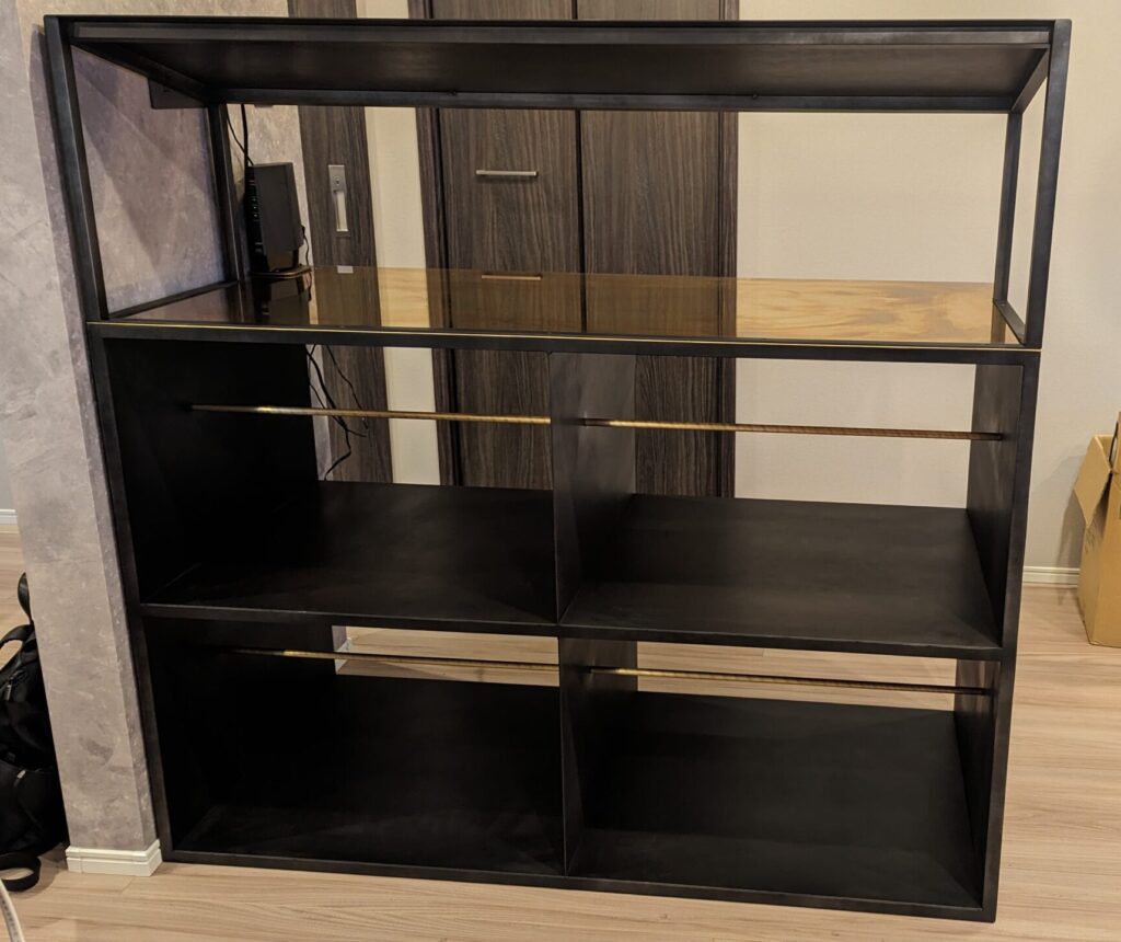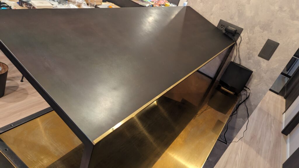Description:設置可能なスペースと使用機材のサイズを基に製作、真鍮の天板とスチールを使用した2段式テーブル。テーブル下はレコード収納スペース。