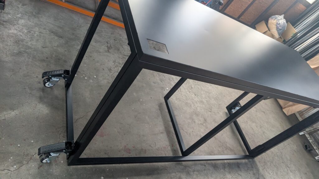Description:全国ツアーに帯同可能な折り畳みで持ち運びができるテーブル。可変式のキャスターで固定と移動がワンタッチで可能。