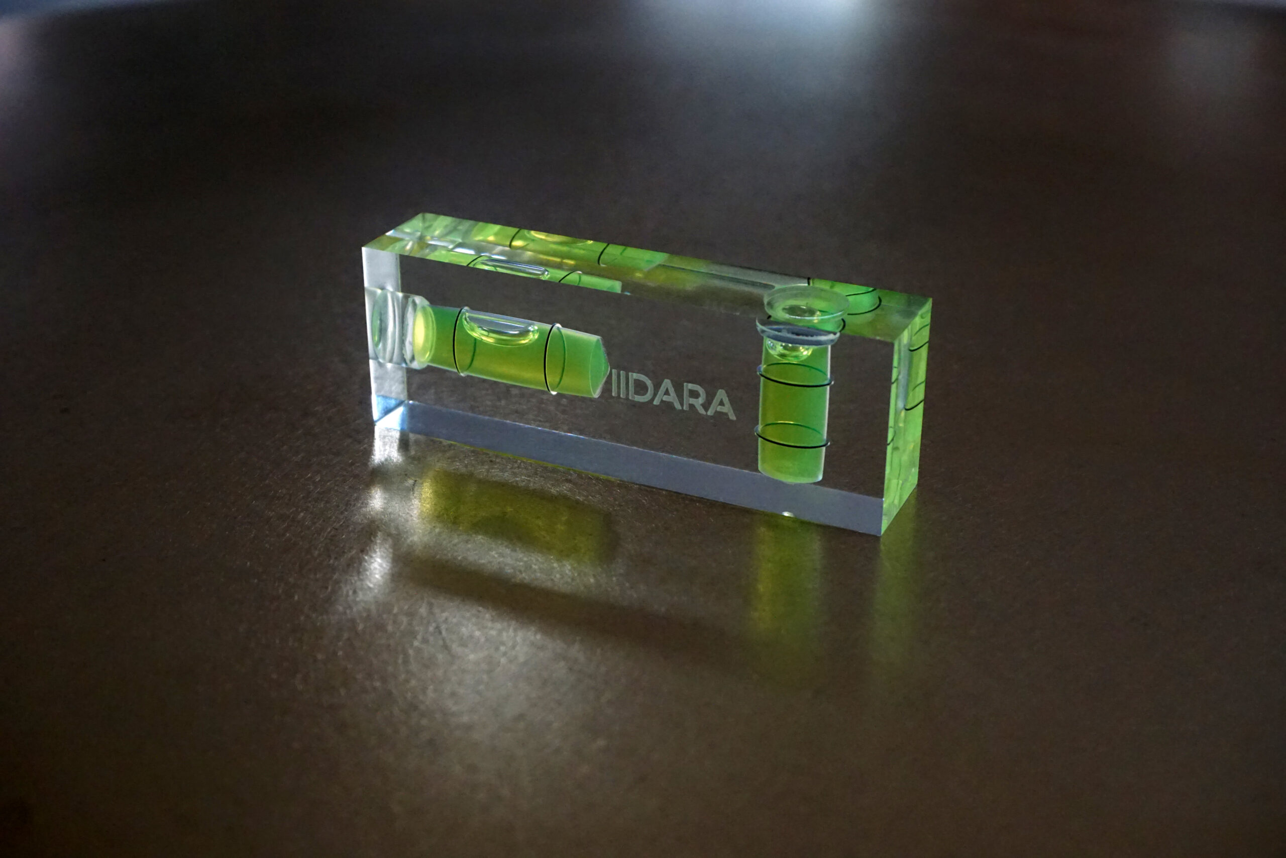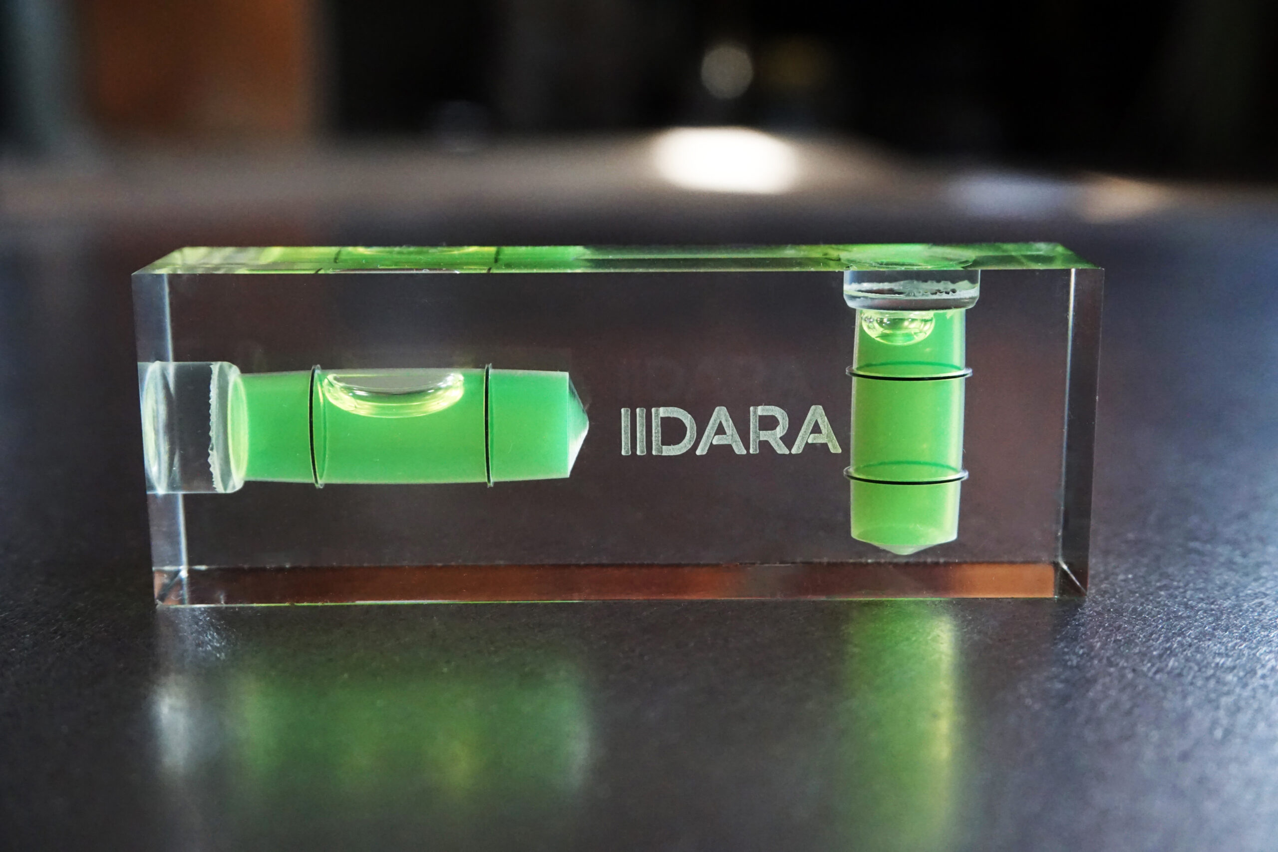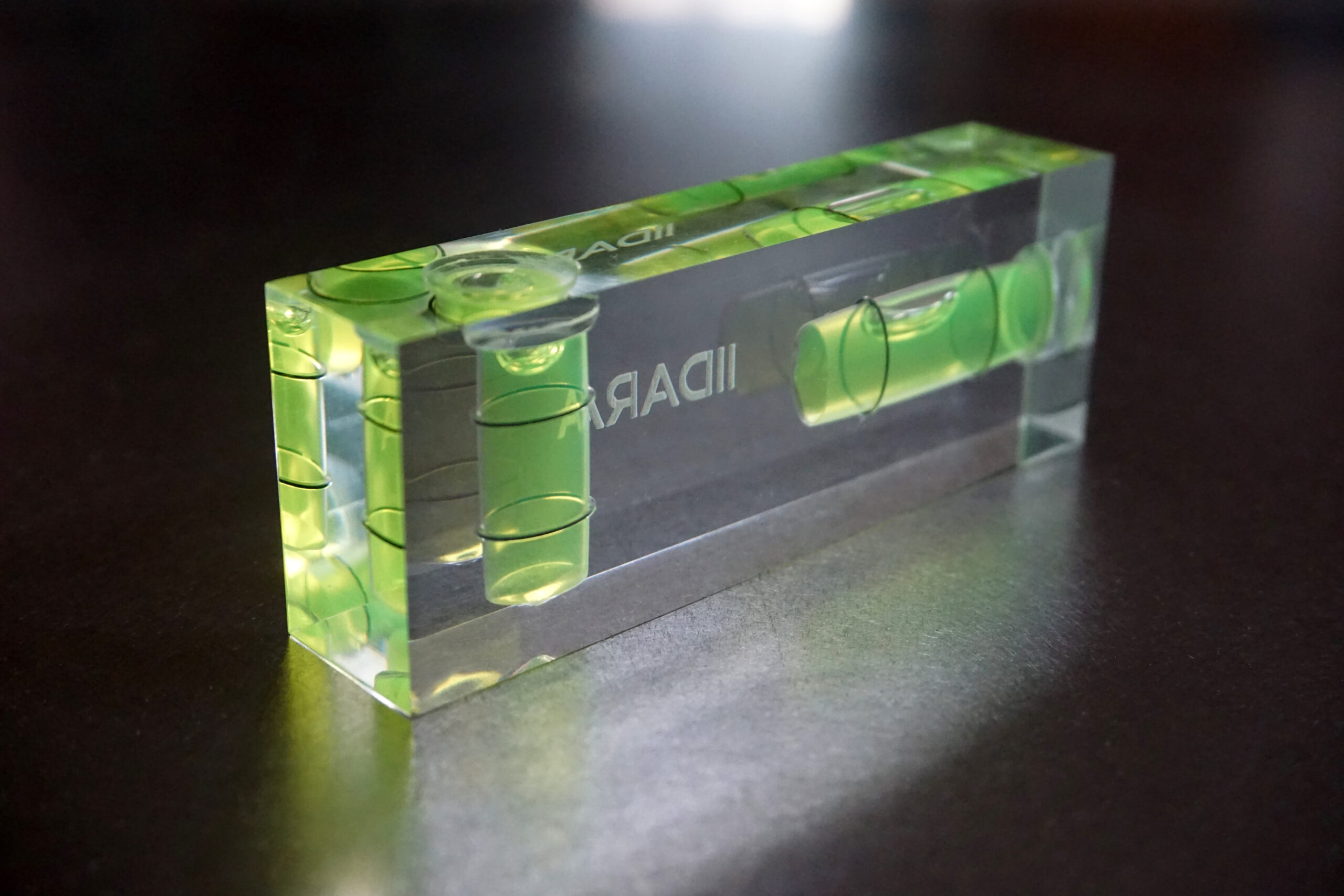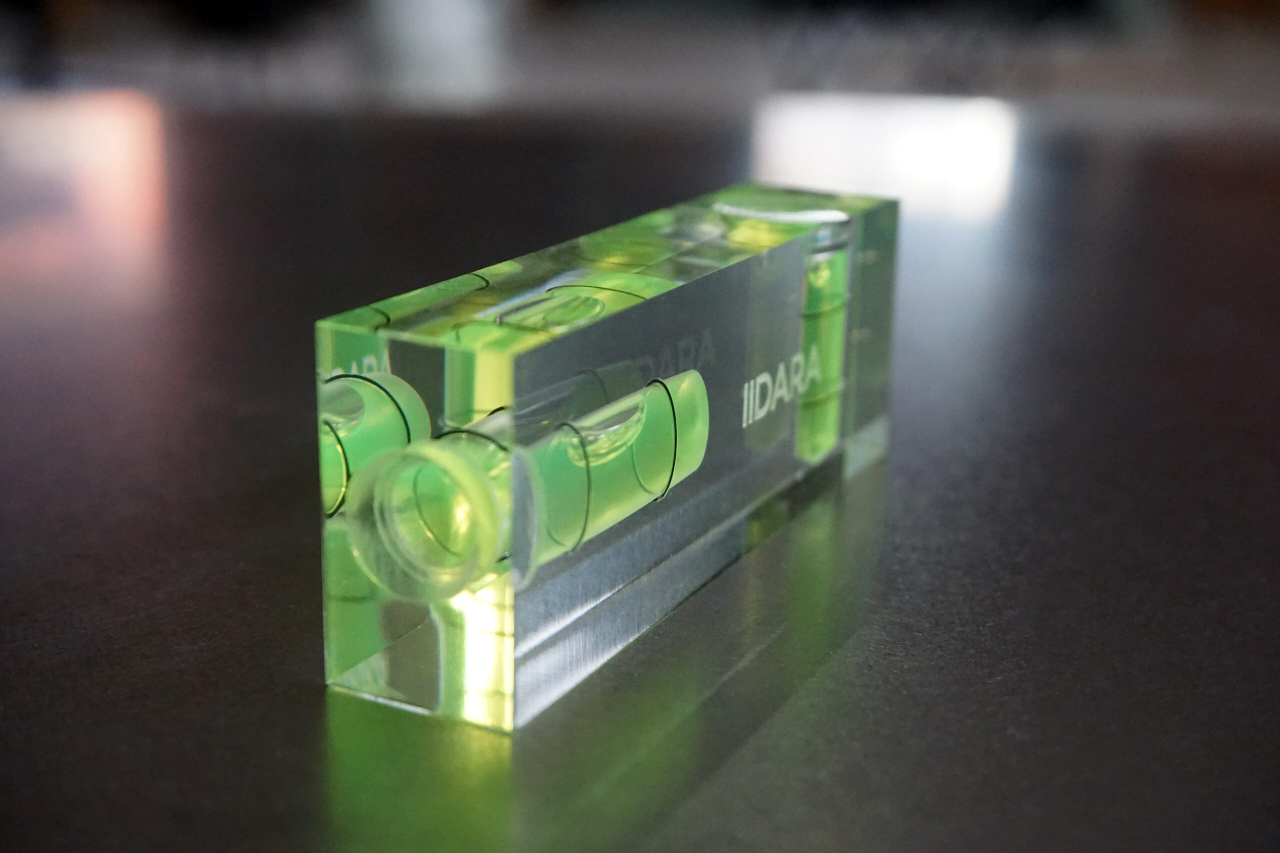 IIDARA特製、精密測定機器を手がけるアカツキ製作所の特注水平器です。ベースとなるのは、同社におけるアクリル製小型水平器、「平型アイベル水平器」。長年培われた確かな技術と精度をそのままに、IIDARAの視点でプロダクトとして再構成しました。
