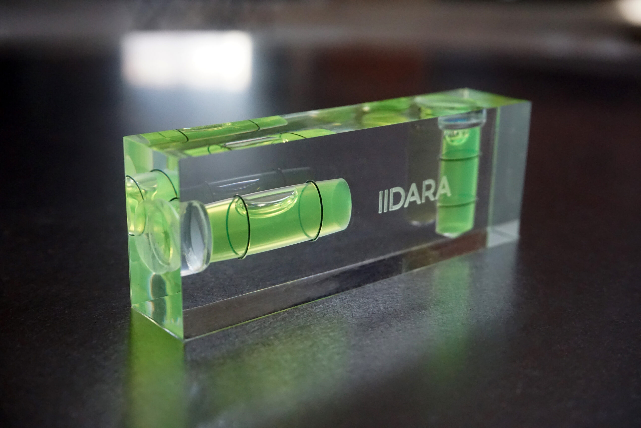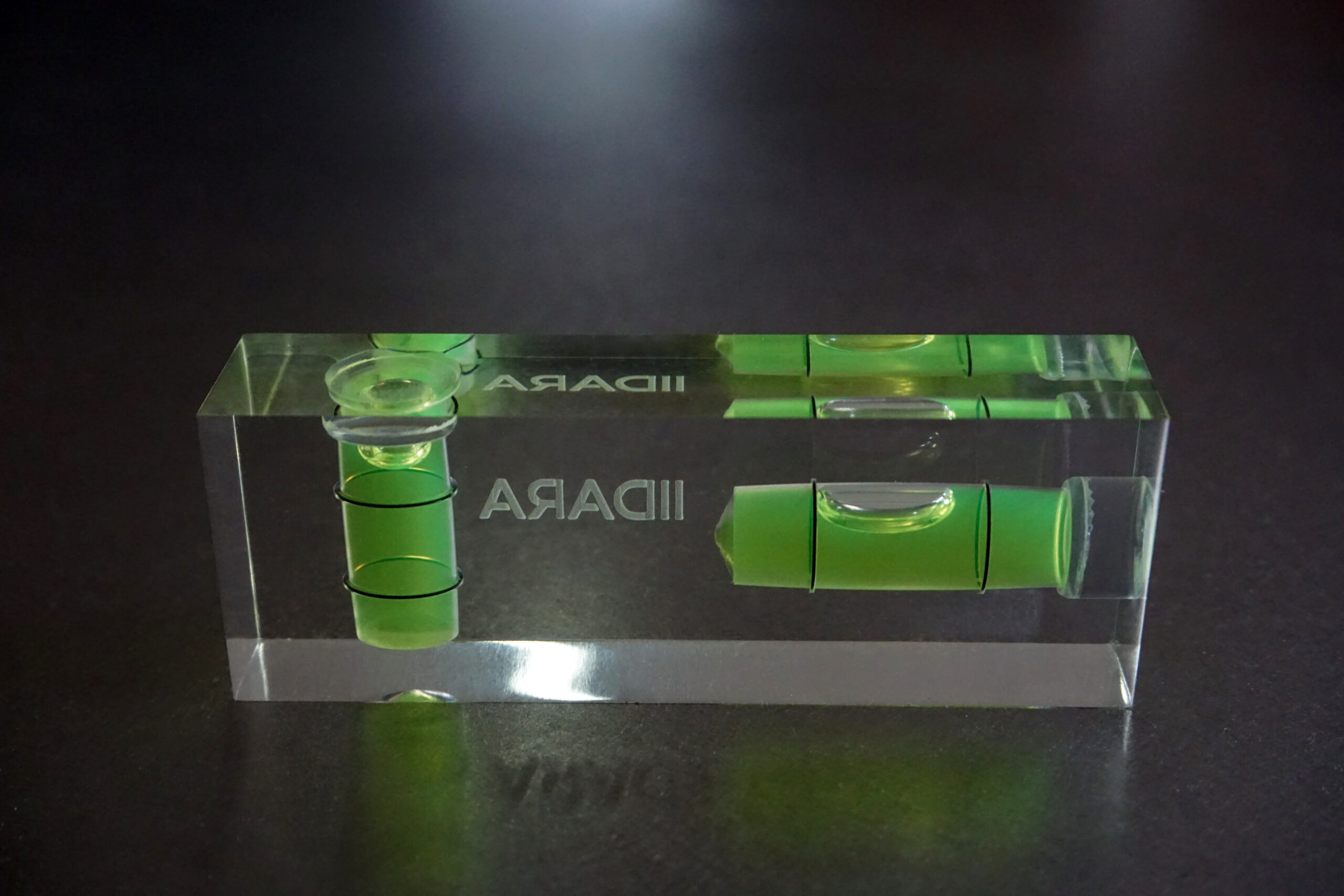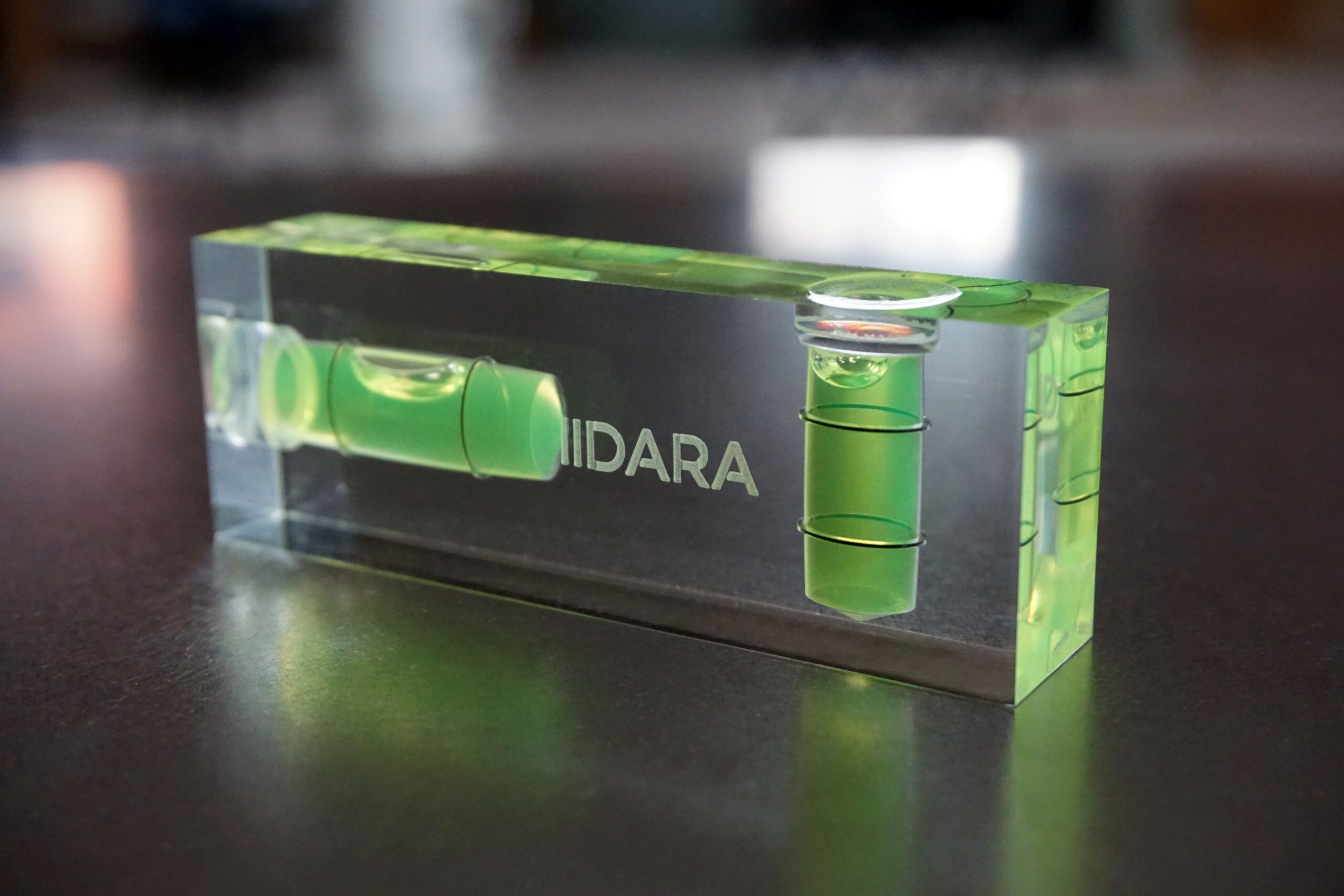 IIDARA特製、精密測定機器を手がけるアカツキ製作所の特注水平器です。ベースとなるのは、同社におけるアクリル製小型水平器、「平型アイベル水平器」。長年培われた確かな技術と精度をそのままに、IIDARAの視点でプロダクトとして再構成しました。