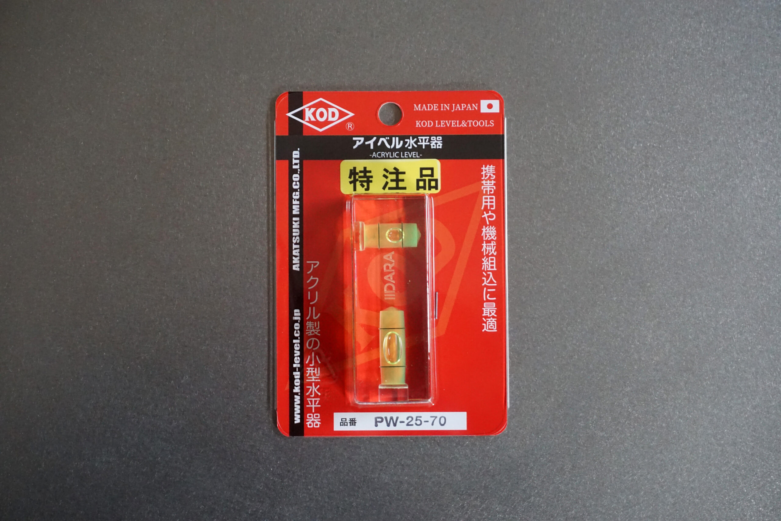 IIDARA Special Edition, this is a custom-made spirit level produced by Akatsuki MFG. Co., Ltd., a company specializing in precision measuring instruments. The base model is their acrylic compact level, known as the “Flat Type Eye-Bell Spirit Level.” Retaining the reliability and accuracy cultivated over many years, it has been reinterpreted as a product through IIDARA’s perspective.